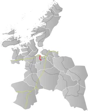 Norwegian County Road 709 (Norwegian: Fylkesvei 709, abbreviated as Fv709) is a Norwegian county road which runs between the villages of Børsa and Hove in the municipality of Skaun in Trøndelag county, Norway. The 14.1-kilometre (8.8 mi) long road intersects with the European route E39 at its northern terminus. Prior to 1 January 2010, this road was a Norwegian national road; on that date the regional reform came into force, and the status of this road was downgraded from a national road to a county road.[1]