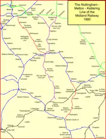 The Nottingham direct line of the Midland Railway was a new route created in 1879 to relieve congestion on the established routes of the Midland Railway, in England. It consisted of two connecting lines that, together with part of an existing route, formed a new route from Nottingham to near Kettering. The line was used for Nottingham to London express passenger trains, and for heavy mineral and goods trains heading south. As well as shortening the transit a little, the new line had the effect of relieving congestion on the original main line through Leicester, that had become excessively congested.