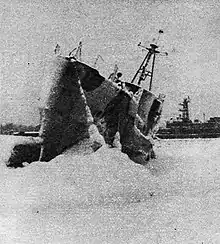 From 1959 to 1963 Kompas underwent a major retrofit at the Polish Navy Shipyard.[1] At the end of December 1971 the ship was converted to a military hotel quarters barge BK-4 at Gdynia shipyard.[1] In 1977 it was designated to salvage.