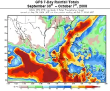 Floods in Guatemala overflowed rivers and caused landslides in Izabal and Petén departments, blocking many roads.[45] The rising rivers damaged about 175 houses, forcing hundreds of people to leave their homes.[46] About 67,000 ha (170,000 acres) of crop fields were damaged or destroyed, including corn, rice, and beans,[43] and crop damage nationwide was estimated at Q128.9 million (2008 GTQ, US$16.8 million). About 2.5% of the national corn crop and 3.7% of the rice crop were wrecked during the floods.[47] Nationwide, about 4,000 houses and 82 roads were damaged or destroyed,[23] and 17 people died in the country from the floods.[43] In neighboring El Salvador, floods affected the houses of about 600 families.[10] High levels forced officials to release water from several dams, causing urban flooding. Along the coastline, the floods damaged maize and bean crops.[23] The average rainfall across El Salvador for the month of October was 475 millimetres (18.7 in). This was the third-highest for October since such record keeping began in 1971, after 2005 when Hurricane Stan struck and 1998 when Hurricane Mitch crossed the area.[48] The tropical depression killed one person in the country.[2]