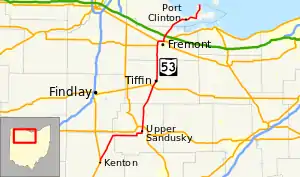 State Route 53 is a north–south state highway in the U.S. state of Ohio (physically northeast-southwest). Its southern terminus is at the beginning of the U.S. 68/S.R. 67 concurrency in Kenton, Ohio, and its northern terminus is on Catawba Island in Ottawa County, north of Port Clinton.