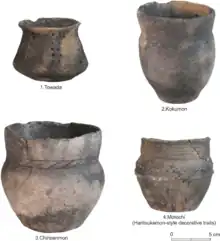 Pottery produced by the Okhotsk is flat based and has a plain body. Decoration is concentrated around the exterior of the rim showing several types of easily distinguishable decorative motifs. The Okhotsk cultural sequence can be divided into four stages in northern Hokkaido, according to the four main styles of pottery. Given the challenges associated with the dating of Okhotsk culture assemblages – as most datable materials are heavily exposed to marine reservoir effects – most chronological work on the Okhotsk is based on comparative analyses of pottery and seriation.[29] The most distinctive and common external feature of Okhotsk ceramic containers is the thick residual organic residue inside and outside the orifice and on the upper part of the walls, and sometimes in the lower part as well. Phosphate chemical analysis of the residue reveals a high content of phosphorus, which indicates an animal origin of organic matter rich in fat. The main function of this pottery was cooking animal products.[30]