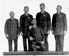 The Oklahoma City Police Department was officially formed following the Land Rush of 1889 in central Indian Territory.[3] The department began as a small collection of officers. The department's first Chief was Charles F. Colcord and municipal court was held in a small tent near California Avenue.[3] By the turn of the century, public drinking had caused many quality of life issues for the small community.[4] In 1907, Oklahoma voters approved a liquor prohibition.[5] A new City Charter was adopted early in March 1911. One of the Charter's provisions changed the office of the Chief of Police from elective to appointive. The charter also adopted a commissioner form of government.[3] In July 1911, Mayor Whit Grant named Bill Tilghman as police chief.[3] Tilghman had earned a reputation in the Western frontier having served as a U.S. Marshal, where tracked down outlaws like Bill Doolin.[3] Under Tilghman's leadership, the OCPD rigorously targeted gambling, bootlegging, and prostitution rings.[4]