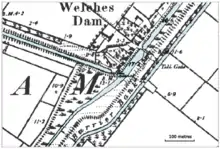 Vermuyden's Drain or the Forty Foot Drain was constructed in 1651 to drain fenland to the north of Chatteris. It was joined by the Cranbrook Drain just before it joined the Old Bedford River at Welches Dam.[20] There is a third channel between the Bedford Rivers, which is now known as the River Delph. It begins near where Vermuyden's Drain ends, and runs parallel to the Old Bedford River for most of its length, before crossing the washland to join the New Bedford River at Welmore Lake Sluice, 1.75 miles (2.8 km) above Denver Sluice.[21] Its history is obscure, as its construction does not appear to have been documented. It was built some time after the Bedford Rivers,[22] and at some point, a bend was added to the Old Bedford River at Welches Dam. This probably occurred after 1789, when C N Cole's map of the Bedford Level showed the original straight course, and before 1821, when R G Baker's map of Cambridgeshire showed it with the bend.[23] Blair offers an explanation, although he admits that it is conjectural. After Vermuyden's Drain was cut, it was found that water could flow up the Old Bedford River, rather than down it towards Denver. Edmund Welche, an engineer who worked with Vermuyden, then built a dam across the Old Bedford River just upstream of the junction. This resulted in water flowing down the Old Bedford River flooding the washes, and so the River Delph was cut. The Old Bedford River was slewed sideways to join the new channel, and a bank was built between the Delph and the downstream portion of the Old Bedford River to maintain the integrity of the washland.[17] Cole writing in 1784 stated that the purpose of the Delph was to make emptying of the washland easier.[22] This has resulted in the Old Bedford River having two sections, which are not connected together. The upstream section flows down from Earith to Welches Dam, and then flows into the River Delph. The Counter drain which runs to the west of the upstream section has a similar kink in it where it joins Vermuyden's Drain, and they then flow into the downstream section of the Old Bedford River, which joins the tidal Great Ouse at Old Bedford Sluice near Denver.[24]