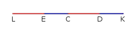 Therefore, as the ratio of LH to HK has doubled the original distances CD and EC, similarly divide the magnitudes A and B into a ratio of eight to six (a transformation that conserves their original ratio of four to three), and align them so that the A units (red) are centred on E, while the B units (blue) are centred on D.