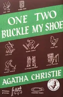 One, Two, Buckle My Shoe is a work of detective fiction by Agatha Christie first published in the United Kingdom by the Collins Crime Club in November 1940,[1] and in the US by Dodd, Mead and Company in February 1941 under the title of The Patriotic Murders.[2] A paperback edition in the US by Dell books in 1953 changed the title again to An Overdose of Death. The UK edition retailed at seven shillings and sixpence (7/6)[1] while the United States edition retailed at $2.00.[2]