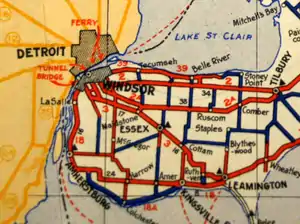 Highway 18A was first assigned during the late 1930s. Essex County council requested that the lakefront road between Malden Centre and Kingsville be taken over by the province and designated Highway 18A in June 1935.[7] The Department of Highways (DHO), predecessor to the Ministry of Transportation, assumed the road on April 13, 1938.[2] The gravel road was paved from Colchester to Kingsville in 1951, and from Malden Centre to Colchester in 1952.[8][9] Following recommendations presented in the Selkirk Report in June 1976, the renamed Ministry of Transportation and Communications rebuilt the road to proper standards, including bypassing several corners; the bypassed route is now Twin Gables Drive and Dolson Road. Subsequently, the entire length was transferred to Essex County effective July 1, 1978. Essex County promptly resigned the route as Essex County Road 50.[3][10] It is now also known as Heritage Road east of Colchester.[4]