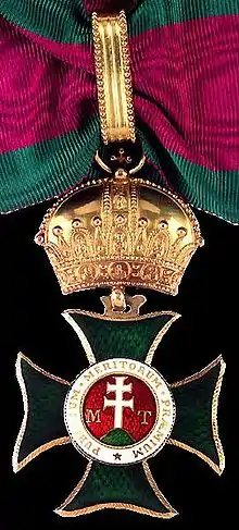The Order of Saint Stephen (Hungarian: Szent István rend) was an order of chivalry founded in 1764 by Maria Theresa. In 1938, Miklós Horthy took the rights and activities of Grand Master as Regent of Hungary. The name of the Order changed to the Royal Hungarian Order of Saint Stephen (German: Königlich Ungarischer Sankt-Stephans-Orden, Latin: Ordo Equitum Sancti Stephani Regis (Hungariae) Apostolici). The Order was terminated at the time of the proclamation of the Second Hungarian Republic in 1946. It was recreated in 2011 as the Hungarian Order of Saint Stephen, and to this day remains the highest order in Hungary.[1][2][3]