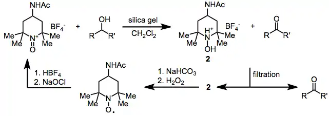 Oxoammonium-catalyzed oxidation reactions involve the conversion of organic substrates to more highly oxidized materials through the action of an N-oxoammonium species. Nitroxides may also be used in catalytic amounts in the presence of a stoichiometric amount of a terminal oxidant.[1] Nitroxide radical species used are either 2,2,6,6-tetramethylpiperidine-1-oxyl (TEMPO) or derivatives thereof.