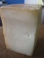 P'tit Basque is a cheese that was introduced in 1997,[1] and was created by the French dairy giant Lactalis. P'tit Basque is made with pasteurized sheep's milk and is aged 70 days. It is covered in a thin light brown rind that has a basket weave pattern that was created in the curd pressing process, and then is covered in plastic wrap to prevent molding. It comes in relatively small wheels that weigh about 1.25 lb (0.57 kg). It has a fat content of 45%.[2]