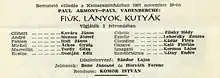 Cast of the premiere of the play Fiúk, lányok, kutyák (Face to the Wind/No More Vacation for the Good Lord) by Paul Armont & Paul Vandenberghe, November 29, 1957 in the chamber theatre of the National Theatre of Szeged, Hungary