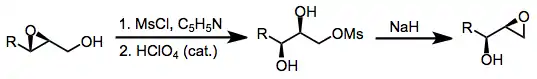 An alternative method that leads to retention of configuration at C-2 involves mesylation of an epoxy alcohol, epoxide opening, and re-closing by displacement of the mesylate.[11]