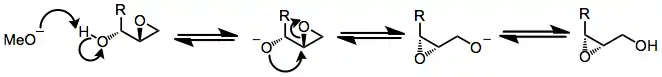 Under basic, protic conditions, 2,3-epoxy alcohols undergo a rearrangement in which the alcohol oxygen opens the epoxide with inversion of configuration, forming an isomeric 1,2-epoxy alcohol. Overall, the Payne rearrangement represents a migration of the epoxide. Although the migration itself is fully reversible, nucleophilic opening under Curtin–Hammett conditions provides good yields of functionalized diols derived from a single epoxy alcohol isomer.[2] Intramolecular electrophilic trapping of the new alkoxide generated upon rearrangement may also be used to drive the reaction to completion. In some cases, the thermodynamic difference between epoxide isomers is large enough to obtain a single isomer in synthetically useful yield without relying on kinetic differences associated with trapping.