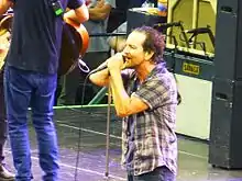 On April 18 the band announced that they will not be playing their previously scheduled show in Raleigh on April 20 due to the controversial Public Facilities Privacy & Security Act (also known as House Bill 2).[29][30][31] Frontman Eddie Vedder addressed the crowd at the Hampton show about the cancellation in Raleigh saying "It was a hard process because we thought we could still play and make things right and we could fortify all the people on the ground working to repeal this despicable law".[32][33] Bruce Springsteen and Ringo Starr also cancelled concerts in North Carolina in protest of the bill.[34][35] At the concert in Columbia, Vedder called out Senator Lee Bright, who is also proposing a bill similar to HB2.[36] At the same show, Pearl Jam paid tribute to Prince, who had died earlier that day, with Vedder saying "Prince was probably the greatest guitar player we've ever seen" before playing a snippet of "Purple Rain".[37][38]
