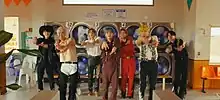 Set in a post-pandemic world,[36] the band members are seen dancing in multiple settings including a sunny locale, a laundromat, and a patio.[37] The video's emphasis on service workers echoes the message of BTS's 2018 song "Anpanman," which was inspired by the Japanese picture book hero of the same name and was a promise by the members to give their all in improving the lives of fans; when they debuted their performance, they dressed in the uniforms of firefighters and construction workers, the everyday superheroes who do the same. Similar scenes can be seen in "Permission to Dance," which also features scenes of masked-up employees being welcomed back to work after a year away, a server dancing by herself in a deserted restaurant, a janitor dancing with a teacher in a deserted school hallway, and a mail carrier spotting one of those ubiquitous purple balloons while performing her job. The last 60 seconds of the music video are devoted to the team that works with BTS behind the scenes, and they include a large group of stylists, choreographers, makeup artists, and everyone else who contributes to the creation of music by dancing to the song's choreography with the members.[38]