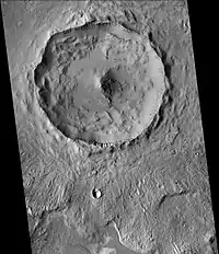 Persbo is an impact crater in the Elysium quadrangle of Mars. It measures 19.5 kilometer in diameter and was named after Persbo, Sweden.[1] It is just south of the Cerberus Fossae, and is adjacent to the Athabasca Valles, which issue from one of the fossae. Impact craters generally have a rim with ejecta around them, in contrast volcanic craters usually do not have a rim or ejecta deposits. As craters get larger (greater than 10 km in diameter) they usually have a central peak.[2] The peak is caused by a rebound of the crater floor following the impact.[3]
