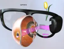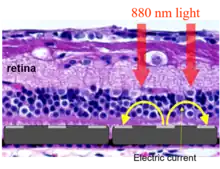 Photovoltaic retinal prosthesis is a technology for restoring sight to patients blinded by degenerative retinal diseases, such as retinitis pigmentosa and age-related macular degeneration (AMD), when patients lose the 'image capturing' photoreceptors, but neurons in the 'image-processing' inner retinal layers are relatively well-preserved.[1] This subretinal prosthesis is designed to restore a patients' sight by electrically stimulating the surviving inner retinal neurons, primarily the bipolar cells. Photovoltaic retinal implants are completely wireless and powered by near-infrared illumination (880nm) projected from the augmented-reality glasses. Therefore, they do not require such complex surgical methods as needed for other retinal implants, which are powered via extraocular electronics connected to the retinal array by a trans-scleral cable.[2] Optical activation of the photovoltaic pixels allows scaling the implants to thousands of electrodes.