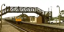 The High Level station continued in use, but reverted to its original name, Pilning, on 6 May 1968.[34] During the 1950s a brick building was built on the northern platform, and around the same time the footbridge had its roof and walls removed, leaving users exposed to the elements.[9][21] The goods yard was closed on 29 November 1965, with the good loops westbound towards the tunnel cut short in February 1968 and the eastbound loop between the High Level station and the junction removed in May 1969.[9][36]: 185 The Motorail loading bay was used to store a fire service emergency train for the Severn Tunnel, however this had been relocated to Severn Tunnel Junction by 1991.[36]: 72 The Junction and Station signal boxes were closed on 15 March 1971, with control passed to Bristol Panel Signal Box at Bristol Temple Meads.[36]: 184 Passenger services had increased slightly by this point, with nine or ten trains each direction between Bristol and Cardiff from Monday to Saturday and two trains each way on Sundays, but this increase was short-lived, and by 1973 Pilning received only one train per day in each direction.[9][42][45] The station buildings had been boarded up by this point, and by 1982 had been demolished, with the exception of the 1950s brick building. Basic shelters were constructed on each platform as a replacement.[42] The few stopping trains had to be timed for daylight hours, as the station lighting had been disconnected.[16] British Rail was split into business-led sectors in the 1980s, at which time operations at Pilning passed to Regional Railways.[46]
