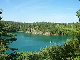 Pink Lake is a meromictic lake located in Gatineau Park, Quebec, Canada. The surface of the waters are a deep green during the month of August and September due to the abundance of algae in the water. The lake is in danger of eutrophication due to human activities. Park management forbids swimming in the lake, walking domestic animals near it, straying from the wooden boardwalk for sight-seers, and throwing stones into the lake.