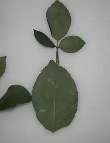 A wide variety of rose species are susceptible to powdery mildew. In light of this it is more practical to discuss the rose varieties that are resistant as opposed to those that are susceptible. Two varieties that have been found to show resistance to rose powdery mildew are "Paul's Pink" rose variety and the "Magic" rose variety.[3] Other research has shown that many chestnut rose (Rosa roxburghii) varieties are also resistant to powdery mildew. Rosa sterilis, Rosa kweichowensis, Rosa laevigata, Rosa lucidissima, and Rosa chinensis have all been shown to be resistant to powdery mildew. R. multiflora var. multiflora and R. multiflora var. cathayensis have all been shown to be susceptible to rose powdery mildew.[4] Symptoms caused by the rose powdery mildew can be a dwarfing of the growth of the plant, or the twisting and deforming of leaves,[5] but more noticeable is a sign of the disease, which is the white condia, the “powder” that appears on the plant surfaces, such as leaves, shoots, flowers, and buds.[1] The fungus may grow on both new and old leaves, but is generally more concentrated on the underside of the leaf [6]