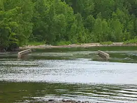 In early spring the reservoir water level is lowered to prevent flooding from spring runoff. During this time you can see part of the Pokiok gorge where the falls once ran.