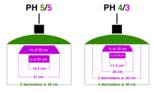 During 1926–27, the Forum lamp design was converted into the rational three-shade system (Danish: 3-skærmssystemet) that could accommodate many different needs. The top, middle, and bottom shades corresponded to the proportions of an approximately 3:2:1 ratio (where the top shade was three-times larger than the bottom shade). (The exception was the largest lamp with 85 cm top shade, which used the 4:2:1 proportions). The first line of lamps were made available in five sizes. The lamps sizes in the system were given rational name scheme: 8/8, 6/6, 5/5, 4/4, and 3/3. The first number in the fraction represents the approximate diameter of the top shade in decimeters. The second number indicates the decimeter used to create the middle and bottom shades using the 3:2:1 ratio. For example: A PH 5/5 lamp has a 50 cm top shade, a 31 cm middle shade (around 2/3 of 50), and a 16.5 cm bottom shade (around 1/3 of 50).[16]