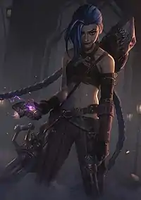 Illustrator Katie De Sousa posted conceptual artwork of the "gun-toting, braid-rocking criminal" that would end up being Jinx on a bulletin board for potential ideas at Riot Games.[1] De Sousa wanted to create a "completely insane female villain who is beyond any kind of reform or rehabilitation" for League of Legends.[2] De Sousa was also a fan of "Attack Damage Carry" (ADC), a term used to describe champions that deal high levels of continuous damage in matches. The character was given the codename "Psycho Arsenal" and remained on the board for months until August Browning, seeking to make a weapon-swapping ADC, decided to work on her with De Sousa. They avoided giving her a "sexy persona" and instead depicted her as a pale and slender woman who wielded disproportionately oversized weapons to make her stand out from other female League champions.[1] The Joker, Gollum, and actress Helena Bonham Carter served as primary inspirations for Jinx's character.[2][3]
