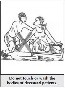 There is risk of transmission in the health facility when a VHF patient dies because the bodies and body fluids of deceased VHF patients remain contagious for several days after death. Family and community members are also at risk if burial practices involve touching and washing the body.[1]