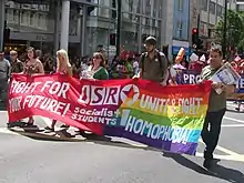 In the United Kingdom, the 1980s saw increased LGBT rights opposition from the right wing Conservative government led by Margaret Thatcher, who introduced Section 28 in 1988 in order to prevent what they saw as the "promotion" of homosexuality as an acceptable lifestyle in schools. However, the Conservatives' main opposition, the Labour Party, did little to address the issue of LGBT rights, ignoring calls from left-wingers such as Ken Livingstone, to do so.[66] Meanwhile, the popular right-wing press featured pejorative references to lesbians, supposedly especially associated with the all-female anti-nuclear protest camp at Greenham Common,[67] and individuals such as Peter Tatchell, the Labour candidate in the 1983 Bermondsey by-election. However, the growing commercialisation of the western gay subculture in the late 20th and early 21st centuries (the "pink pound") has come under heavy criticism from socialists. Hannah Dee remarked that it had reached "the point that London Pride – once a militant demonstration in commemoration of the Stonewall riots – has become a corporate-sponsored event far removed from any challenge to the ongoing injustices that we [the LGBT community] face."[68] At the same time, an anti-war coalition between Muslims (many organized through mosques) and the Socialist Workers Party led a leading member Lindsey German to reject the use of gay rights as a "shibboleth" that would automatically rule out such alliances.[69]