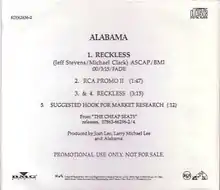"Reckless" is a song written by Michael Clark and Jeff Stevens, and recorded by American country music group Alabama. It was released in August 1993 as the first single from their album, Cheap Seats. The song was their final number one the Billboard Hot Country Singles & Tracks (now Hot Country Songs) chart until June 2011, when they reached the number one position again with a guest vocal on Brad Paisley's "Old Alabama".