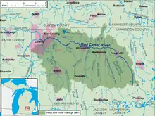 The river's watershed is approximately 461 square miles (1,190 km2) in size.[8] Among the river's larger tributaries, ordered from its mouth to its source, are Sycamore Creek,[5] Pine Lake Outlet[9] (the outflow of Lake Lansing), Sloan Creek,[10] Deer Creek,[11] Doan Creek,[12] Kalamink Creek,[13] the West Branch Red Cedar River,[14] and the Middle Branch Red Cedar River.[15][7] The Red Cedar River Watershed (RCRW) contains a diverse mix of rural lands dominated by agricultural land use and small communities, suburban areas, and highly urbanized lands. The watershed is home to thousands of residents who live, learn, work, and recreate within its lands and waters. Farms, factories, and shopping malls are necessary for quality of life. Equally important are clean water for fishing, swimming, and drinking, and natural landscapes for aesthetic relief. The river and its watershed are also home for a myriad of plants and animals that rely on a clean, protected environment to flourish.[16]