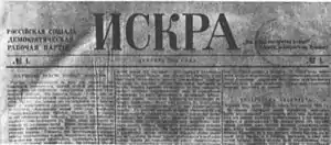 His exile over, Vladimir was banned from Saint Petersburg, instead settling in Pskov, a small town two hours' train ride from the capital, in February 1900. His wife, who had not served the entirety of her sentence, remained in exile in Ufa, where she fell ill.[26] Intent on founding a newspaper, Vladimir and Struve raised money for the publication of Iskra (The Spark), a new organ of the Russian Marxist movement, now calling itself the Russian Social Democratic Labour Party (RSDLP). After visiting his wife, on 29 July 1900, Vladimir left Russia for Western Europe. In Switzerland and Germany, he met with Axelrod, Plekhanov and Potresov, and lectured on the Russian situation. On 24 August 1900, a conference of Russian Marxists was held in the Swiss town of Corsier to discuss Iskra, but both Vladimir and Potresov were shocked at Plekhanov's controlling nature and antisemitism. It was agreed that the paper would be produced in Munich, where Vladimir moved in September 1900. The first issue was printed on Christmas Eve, and contained an article written by Vladimir decrying European intervention in the Boxer Rebellion.[27] A second RSDLP publication, Zarya, appeared in March 1901, and would run for four issues, but Iskra was far more successful, being smuggled into Russia illegally, becoming the most successful Russian underground publication for 50 years. It contained contributions from such figures as the Polish Rosa Luxemburg, the Czech-German Karl Kautsky, and a young Ukrainian Marxist, Leon Trotsky, who became a regular contributor from the autumn of 1902.[28]