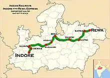 Rewa railway station is connected to Satna through the 50 km Satna-Rewa branch line. Satna falls on the Howrah-Allahabad-Mumbai line.