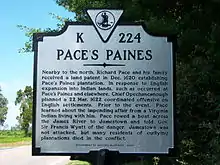 In recent years, archeological excavations have been carried out at the location of the Pace's Paines plantation in an effort to learn more about early colonial life.[8][9] A state historical marker near the location recounts some of the history of Pace's Paines.[10]