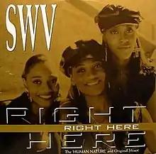"Right Here" is the debut single of American R&B girl group SWV, released on August 20, 1992, as the lead single from their debut album, It's About Time (1992). A remixed version, referred to as "Right Here (Human Nature Remix)" and based around a sample of Michael Jackson's 1982 song "Human Nature", was released in July 1993, and charted on the US Billboard charts as a double-A-side with "Downtown". This version became a number-one R&B single, selling 1,000,000 copies and earning a platinum certification from the Recording Industry Association of America (RIAA).