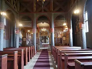 Later restoration in 1921 brought it back a bit closer to its original shape. At one point the church was painted white within, but during the restoration work by Ragnvald Einbu in 1921 the church interior was restored to its original colouring.[12][6]