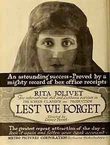 Lest We Forget was shown in Washington, D.C., with Jolivet addressing audiences before three of its screenings. She told the audiences of her riveting personal experiences since the war began in August 1914, when she was in France. In the film she plays Rita Heriot, a Paris soprano who is rescued from the RMS Lusitania sinking after playing an engagement at the Metropolitan Theatre in New York.