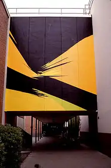 Sunforce represents a critical turning point in her technique. In the context of California with its Light and Space Group, her impasto work may have seemed to make little sense.[14] Also, due to the massive scale of the mural, her current impasto technique was impractical and she was forced to adapt to the flat plane of the mural surface. In Sunforce, the image suggests a large mass that drops, and continues to drop as though it would continue through the bottom and off the painting.[9] The second, was the opportunity to learn printmaking, lithography and eventually silk screen, a technique conducive to hard-edge shapes.[15]