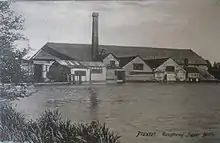This paper mill was marked on Hasted's map and known to be in operation in 1716. It may be the paper mill at Wrotham which William Quelch was working in the period 1723–31.[7] The mill pond was 175 yards (160.02 m) long and 75 feet (22.86 m) wide at the mill, giving an area of 4,375 square yards (3,658 m2). George How Green was the occupier of the mill in 1835 when he leased Hamptons Paper Mill. The mill burnt down in 1917 and was rebuilt and worked by steam power until 1960. It finally closed after damage suffered in the floods of September 1968. The mill supplied paper used for postage stamps. Although often referred to as being in Borough Green, the mill site actually stands within the parish of Platt.[1][2][8][9][10]