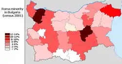 The previous 2001 census recorded 370,908 Romani (4.7% of the population). The preceding 1992 census recorded 313,396 Romani (3.7% of the population), while a secret backstage 1992 census ordered by the Ministry of Interior recorded a figure of 550,000 Romani (6.5% of the population); the Ministry of Interior ordered at least two other secret censuses to enumerate the Romani in denial, the one in 1980 recorded 523,519 Romani, while the one in 1989 recorded that the number of the Romani was 576,927 (6.5% of the population) and that over half of the Romani identified as Turks.[10] The majority of the estimated 200,000-400,000 Muslim Romani tend to identify themselves as ethnic Turks,[11] some deny their origin, or identify as Bulgarians.