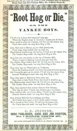 The most popular song of the era was a minstrel song variously titled "Root, Hog, Or Die" or "Do Jog Along", sometimes credited to George W.H. Griffin, which was first copyrighted in 1856.[4] Many variations exista common first verse is: