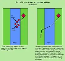 In the vertebrate spinal cord, Robo1 and Robo2 are expressed on commissural axons and act as repulsive receptors for the Slit ligands expressed by floor plate cells located at the midline.[11] In contrast, Robo3/Rig1 is required for midline crossing, and acts in part by antagonizing Slit-mediated repulsion by Robo1 and Robo2.[23]