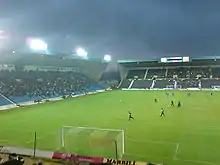 The stadium underwent a major redevelopment in 1994–1995, becoming an all-seater stadium with a capacity of 17,889.[1] During 1994–95 season the stadium capacity was significantly reduced as a result of the construction of three new stands within the groups which were the Moffat Stand, the Chadwick Stand and the East Stand. The completion of these three stands reduced the capacity of the stadium to 18,128.[3] The renovated stadium opened on 6 August 1995, with a friendly match against Blackburn Rovers F.C.[3] Rugby Park has since undergone recent developments regarding further renovations, with an artificial pitch being installed in the summer of 2014, safe standing available from November 2019 and underground heating installed underneath the pitch in 1999.[4] In August 2010, the West Stand was renamed the Frank Beattie Stand in honour of former player Frank Beattie who captained Kilmarnock to the historic Scottish League Championship victory in 1965.[5]