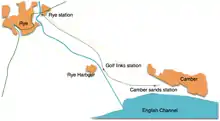 The Rye and Camber Tramway was an English railway in East Sussex. It was of 3 ft (914 mm) narrow gauge, relatively unusual amongst British narrow gauge railways. It operated from 1895 until 1939, connecting Rye to the coast. It was about 1+3⁄4 miles (2.8 km) in length, and had three stations - Rye, Golf Links and Camber Sands. It operated mainly to transport golfers to the golf links and holidaymakers to the coastal dunes.