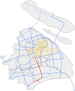 The Shanghai–Jinshan Expressway, commonly referred to as the Hujin Expressway (Chinese: 沪金高速公路; pinyin: Hùjīn Gāosù) and designated S4, is an expressway in the city of Shanghai, China. It runs generally in a north-south direction from the Xinzhuang Interchange, a large interchange with the Outer Ring Expressway, the G60 Shanghai–Kunming Expressway, the G92 Hangzhou Bay Ring Expressway, and Humin Elevated Road in Minhang District to Jinshan District, ending at an interchange with the G15 Shenyang–Haikou Expressway. The expressway is tolled south of the Zhuanqiao Service Area in Minhang District, between the exits to Yindu Road and the Shanghai–Jiaxing–Huzhou Expressway.[1]
