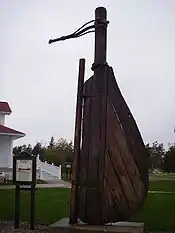 The schooner-barge Michigan was never seen again after the night of 2 October 1901.[1] The wreck of Drake was first discovered by Captain Campbell of Liberty just 4 days after she sank on 6 October 1901, when he was downbound for the Soo Locks. Captain Campbell reported that Drake was located between Vermilion Point and Whitefish Point lying on her side in 40 feet (12 m) of water with about 5 feet (1.5 m) feet of water over her with a floating spar still strung to the hull.[1] The wreck of Drake lay forgotten on the bottom of Lake Superior for 77 years until she was rediscovered at 46°46.588′N 85°05.933′W in 1978, by the Great Lakes Shipwreck Historical Society (GLSHS)[6] who subsequently illegally removed her rudder, windlass, anchor, and a sign board in the 1980s. Michigan’s Antiquities Act of 1980 prohibited the removal of artifacts from shipwrecks on the Great Lakes bottomlands. The Evening News reported a Michigan Department of Natural Resources and Environment 1992 raid on the Great Lakes Shipwreck Museum and its offices that found evidence of 150 artifacts illegally removed from the state-claimed bottomlands, including artifacts from Drake.[7][8][9] Following a settlement agreement with the GLSHS, Drake's rudder, anchor, and windlass are now the property of the State of Michigan.[8][9] The rudder is on loan to the GLSHS for display nearby the Great Lakes Shipwreck Museum and the anchor and windlass is on loan to Whitefish Township for display next to its community building.