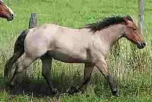 The frame pattern, one of the first spotting patterns to have a DNA test developed, is produced by the Ile118Lys mutation on the equine Endothelin receptor type B gene and when homozygous produces lethal white syndrome.[3][36] Frame is characterized by jagged but sharply defined, horizontally oriented white patches. By itself, the frame pattern does not produce white markings that cross the back, or affect the legs or tail.[3] The expression of the frame pattern varies from minor white markings to the distinctive framed pattern.[37]