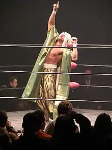 Sabu is nicknamed "The Homicidal, Suicidal, Genocidal, Death–Defying Maniac" due to his mixed style of high-flying and hardcore wrestling.[1] Some of his moves includes using a steel chair, like the Air Sabu (a heel kick to a cornered opponent, with the assistance of a steel chair), the Arabian Facebuster (Jumping, diving or a somersault leg drop, driving a steel chair into the face of the opponent) or the Arabian Skullcrusher (jumping, diving or a somersault leg drop, driving a steel chair into the back of the opponent's head, usually through a table). Being trained by his uncle, The Original Sheik, he also uses his Arabian Clutch (a Camel clutch) as a move. His character has rarely spoken, however while working for WWE he had to do the most talking he ever did.[70]