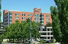 The Salem Hospital Heliport (FAA LID: OG37) is a private heliport located on the hospital's Patient Care Tower (Building A).[14] The previous helipad was eliminated when the parking structure that it resided upon was torn down in 2006 to make way for the construction. During the interim period helicopters landed in the Willamette University's McCulloch Stadium located in Bush's Pasture Park south of the hospital.[15]