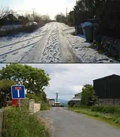![]() Above: Salta after an uncommon winter snowfall. Below: The road leading into the hamlet at the top of the hill. | |
